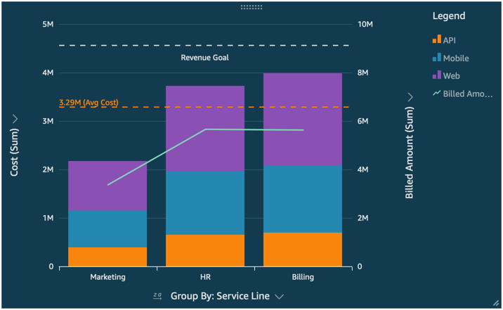 Una riga calcolata viene visualizzata in una posizione basata su un valore che è il risultato di una funzione. Durante la configurazione, si specifica quale misura (parametro) si desidera utilizzare e quale aggregazione applicare. Queste sono le stesse aggregazioni che puoi applicare nei contenitori di campi. Quindi, è necessario fornire un'aggregazione da applicare al calcolo del campo per la riga di riferimento, ad esempio media, minimo, massimo o percentile. Il campo deve essere incluso nel set di dati utilizzato dal grafico, ma non deve essere visualizzato nei contenitori di campi del grafico.
